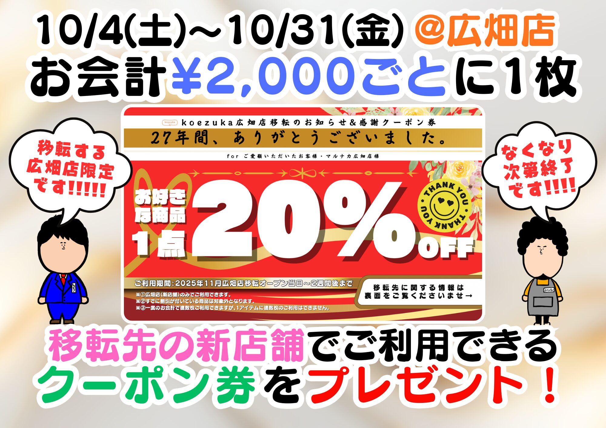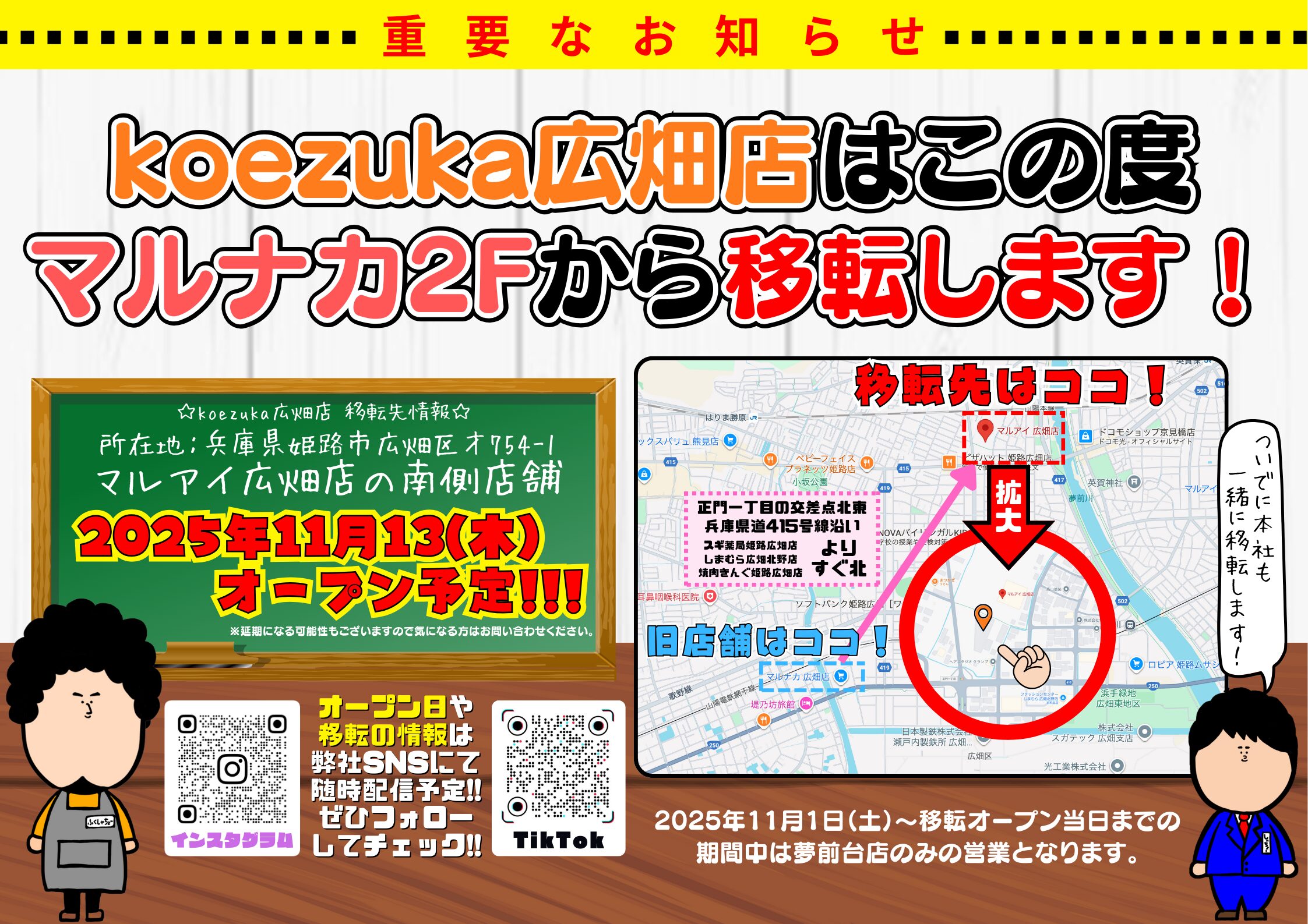 それにつきまして、10月4日(土)〜10月31日(金)までkoezuka広畑店にて閉店セールを開催します🔥