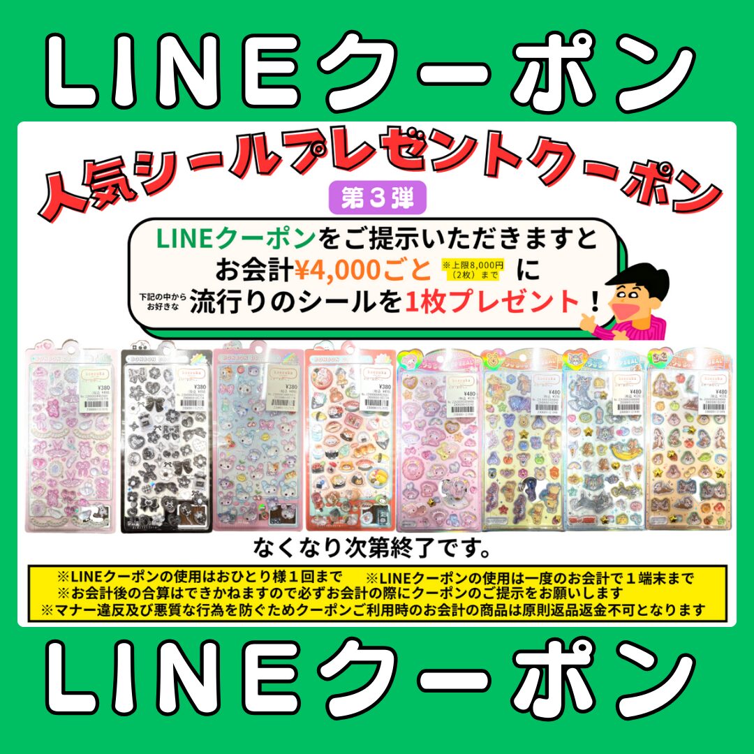 LINEクーポンご提示で、お買い上げ税込4,000円ごとにお好きなシールを1枚プレゼント。上限は2枚まで(お会計8,000円でも12,000円でもプレゼントは2枚)。LINEクーポンはおひとり様1回のみ、1度のお会計にクーポンは1端末のみ有効。